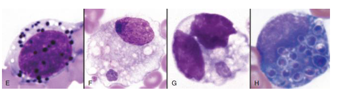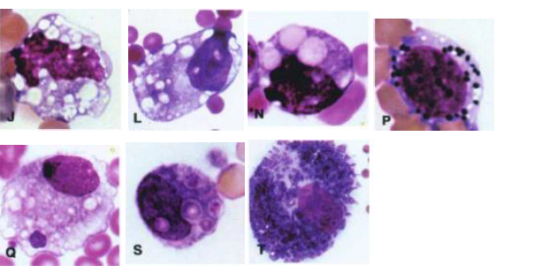 J-Köpekte babesiosis hastalığında aktifleşmiş vakuollü monosit. L-Hemobartunellosis hastalıklı kedinin aktifleşmiş makrofajı. N- Hemobartonellosis hastalıklı kedinin monositi eritrofagositozisle birlikte. P- Malignan melanoma hastalığında melanin granüllerinin bulunduğu monosit. Q-Köpekte Ehrlichia canis inklüzyonu bulunan makrofaj. S- Kedide Histoplasma capsulatum. T. Kedi makrofajında Cytauxzoon felis şizontu