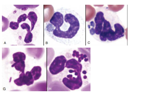 Köpekler için A-3 tane kırmızımsı Distemper inklüzyon cisimciği B- Ehrlichia ewingii inklüzyonu. C-Anaplasma phagocytophilum inklüzyonu G-Lökopeni ve septisemisi bulunan kedide bakteri basilinin nötrofil tarafından fagosite edilmiş görünümü. H- Köpekte Staphylococcus intermedius enfeksiyonunda basilin fagosite edilmiş görünümü